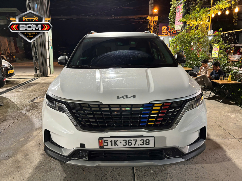 Nhìn từ trực diện, KIA Carnival gây ấn tượng với bộ lưới tản nhiệt mũi hổ cỡ lớn gồm vô số hoạ tiết hình khối chữ nhật mạ crom sáng bóng. Nối liền là cụm đèn trước có thiết kế thanh mảnh, đèn pha sử dụng công nghệ LED thích ứng hiện đại kết hợp cùng tính năng tự động bật/tắt.